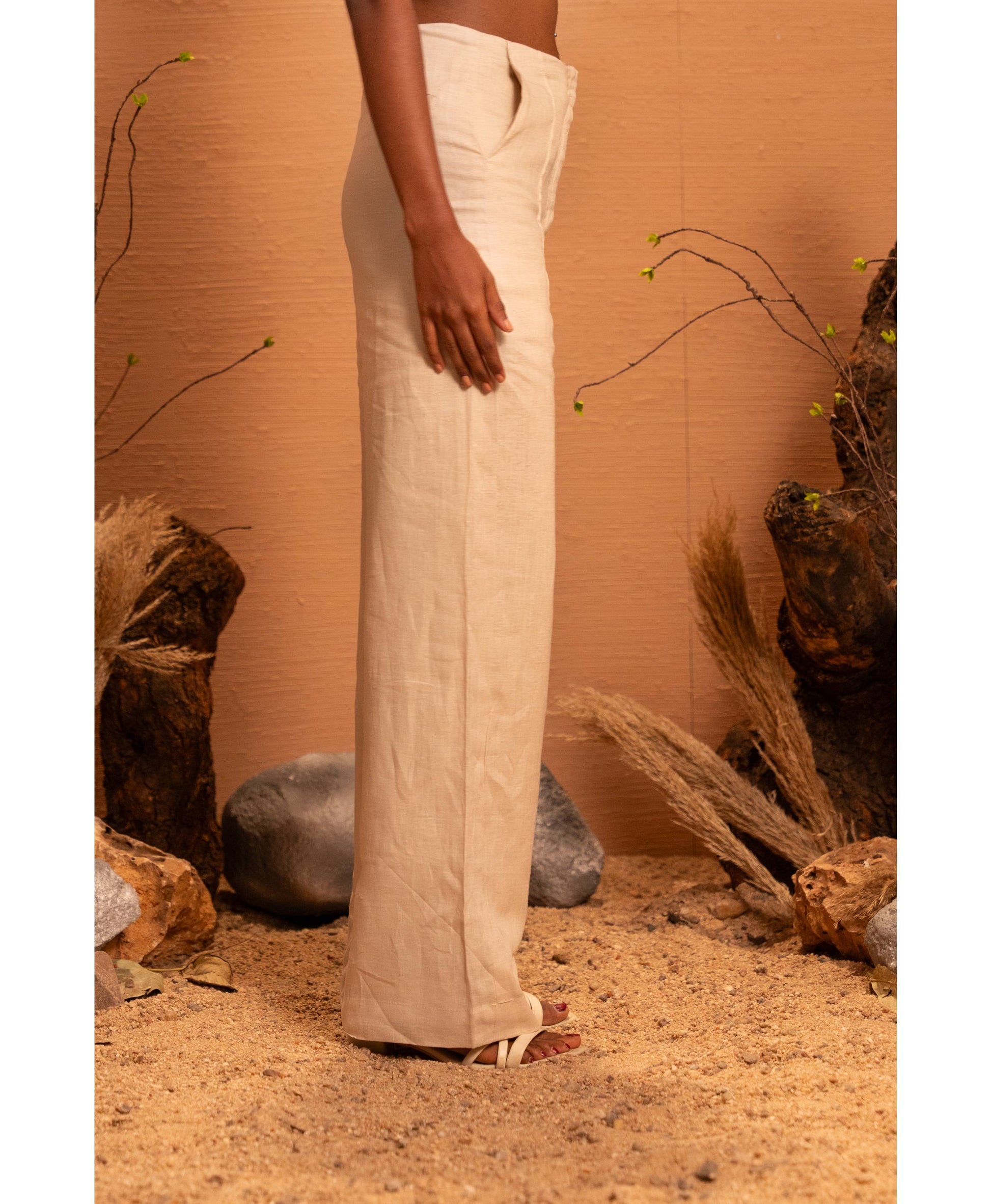 Designed with a smooth front, subtle seam detailing, and breathable linen that moves with ease, these pants pair beautifully with shirts, crop tops, or co-ord jackets for a refined, minimalist aesthetic.