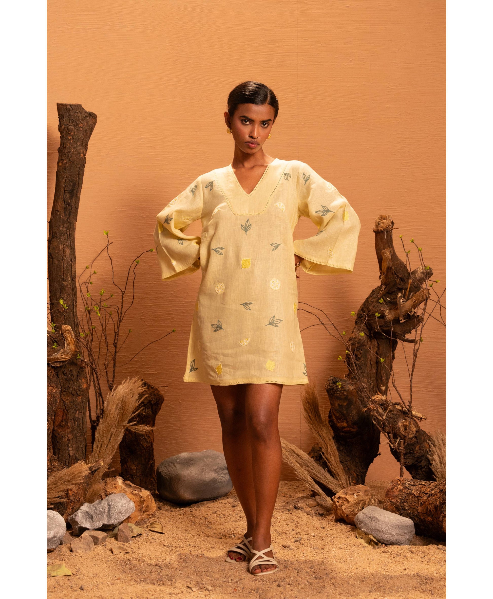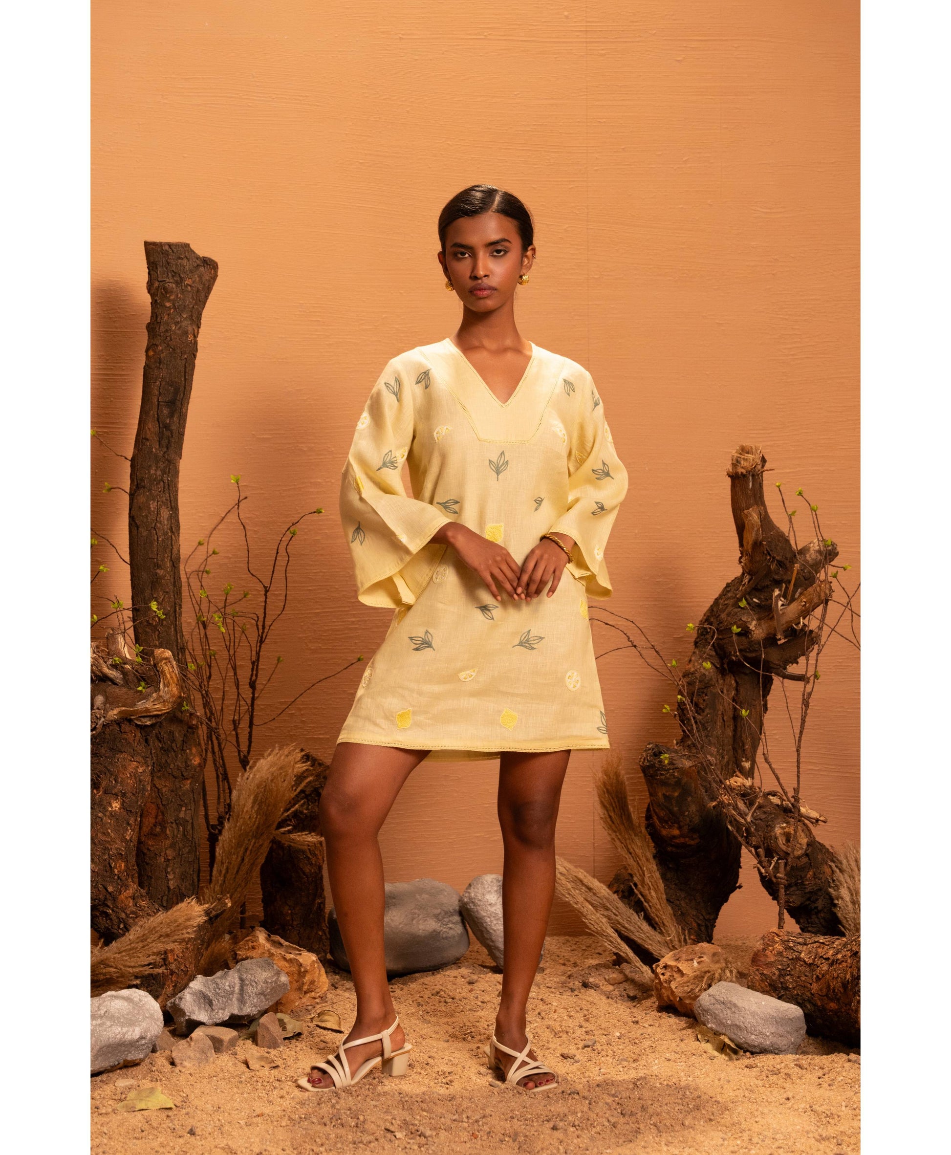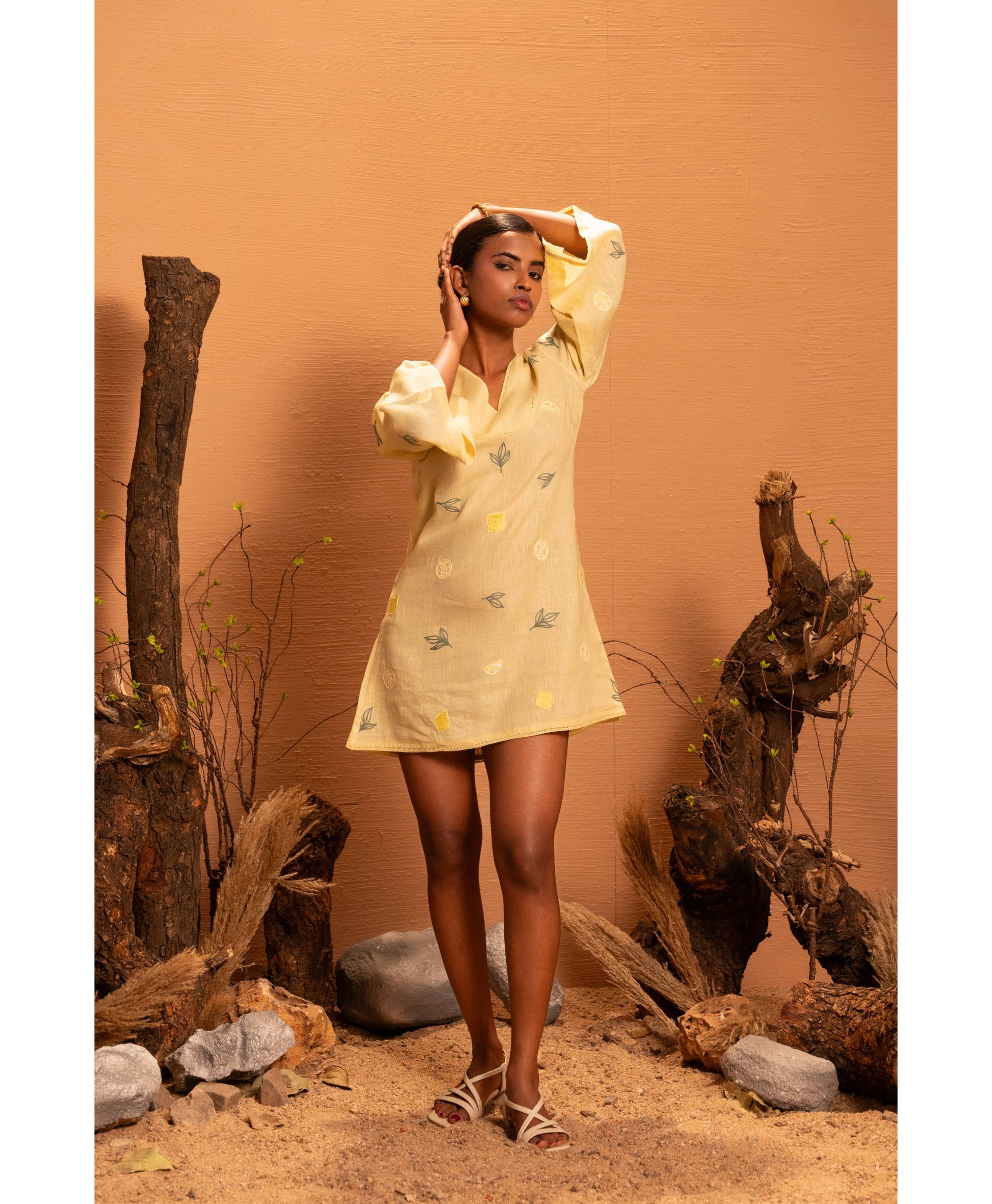 * Lemon Yellow dress with citrus-toned embroidery motifs