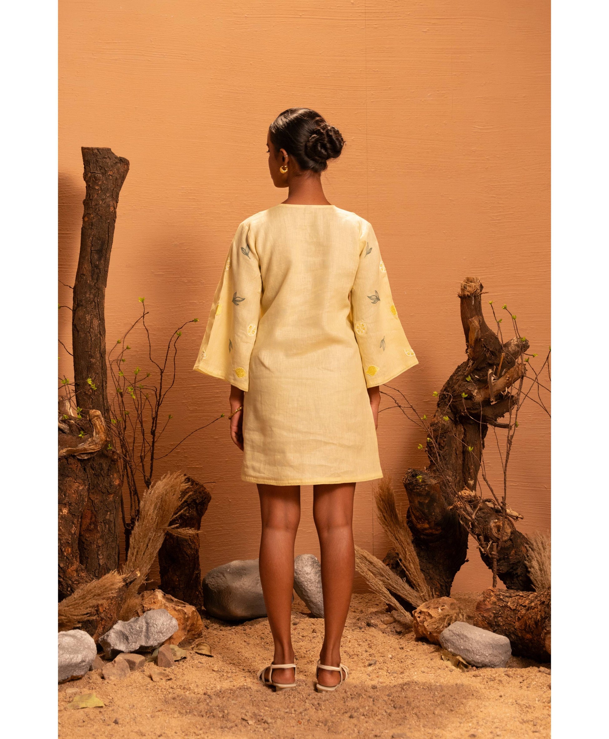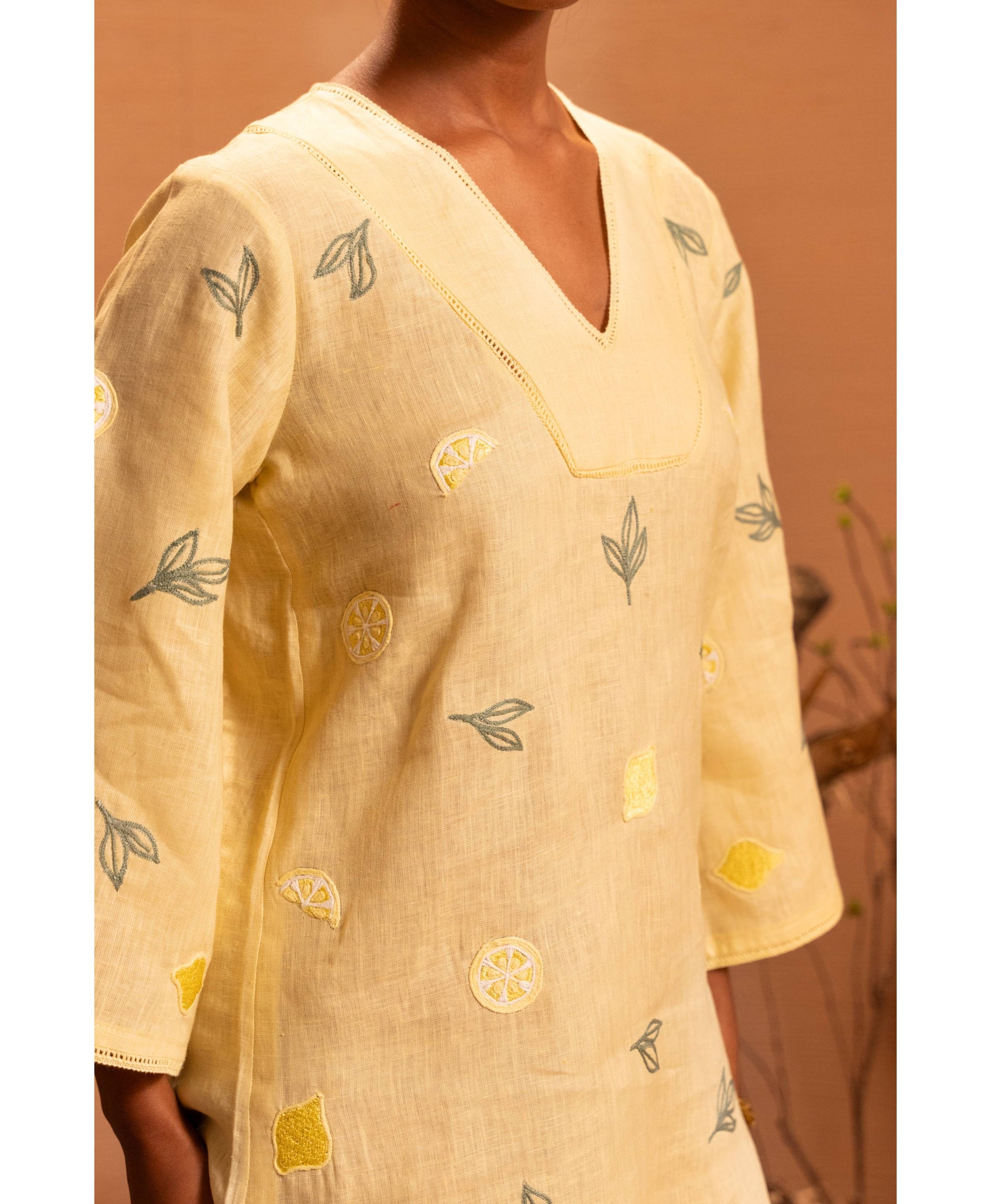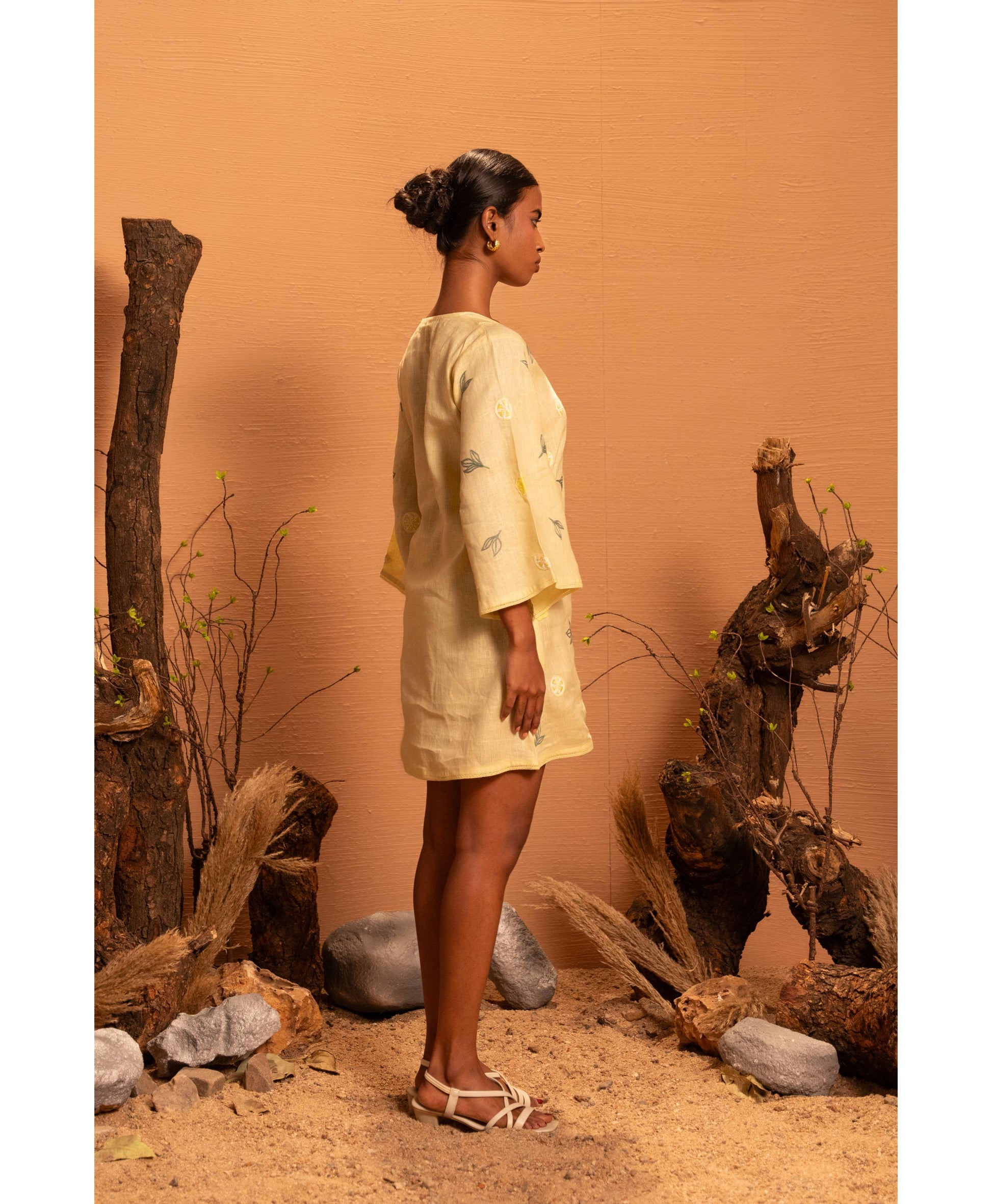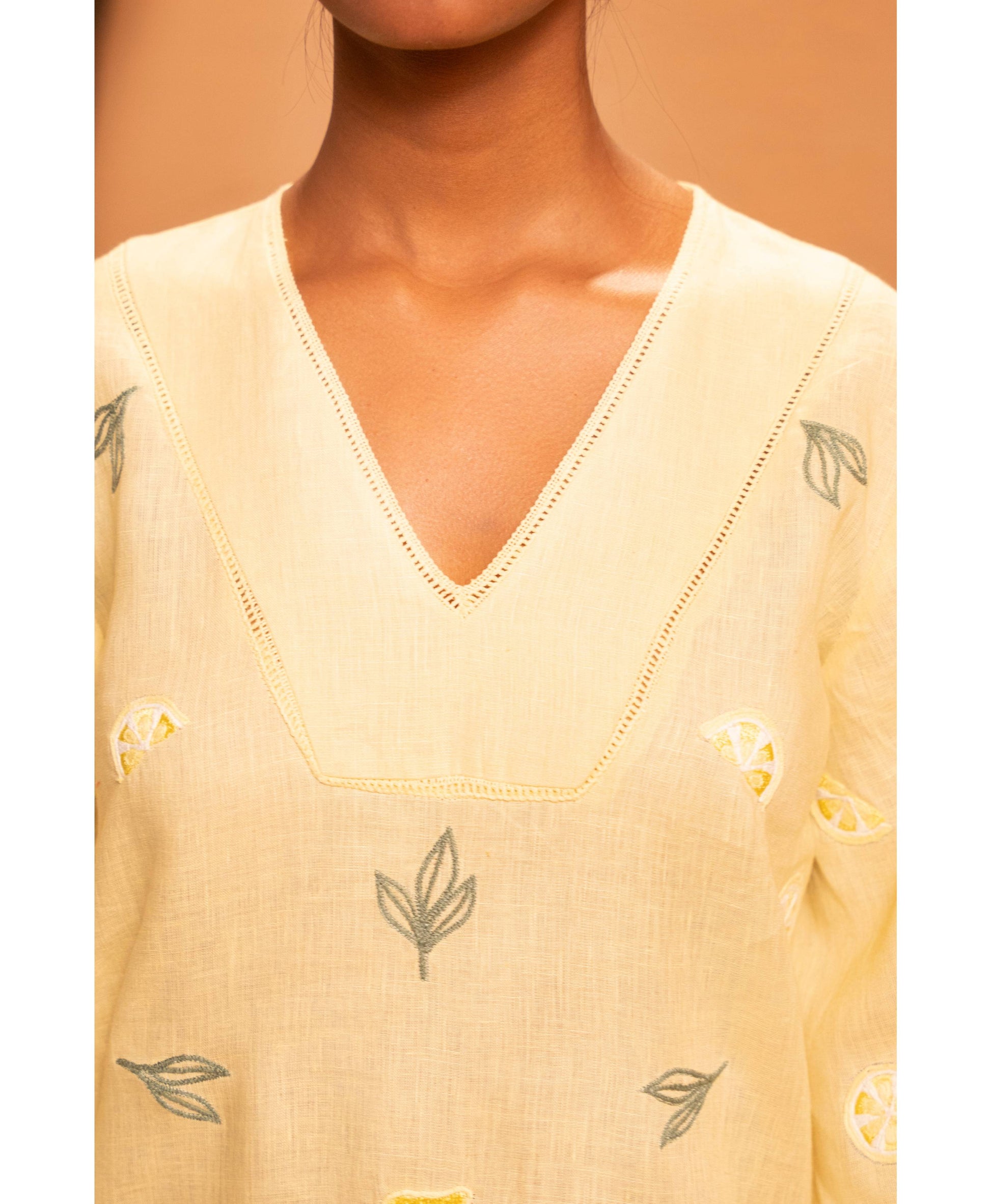 * Lemon Yellow dress with citrus-toned embroidery motifs