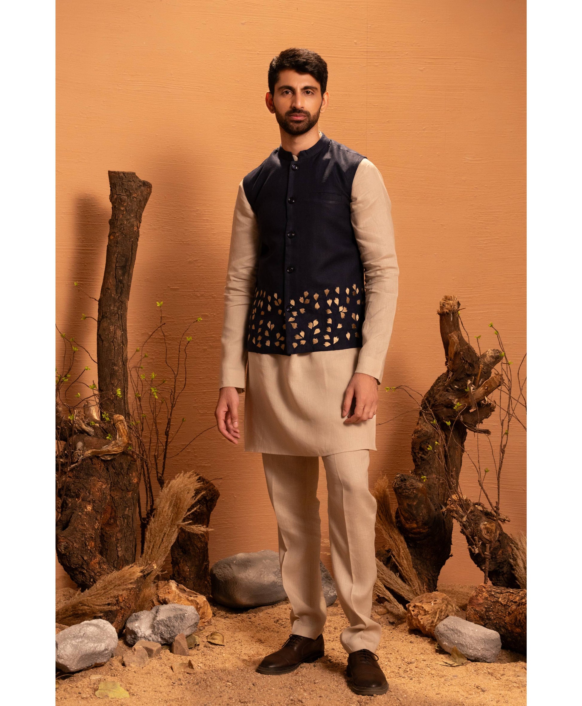 Leafscape is a modern interpretation of classic elegance, crafted in premium 100% linen. The navy blue base creates a serene canvas for the striking beige machine-embroidered leaf motifs that frame the lower half of the jacket.