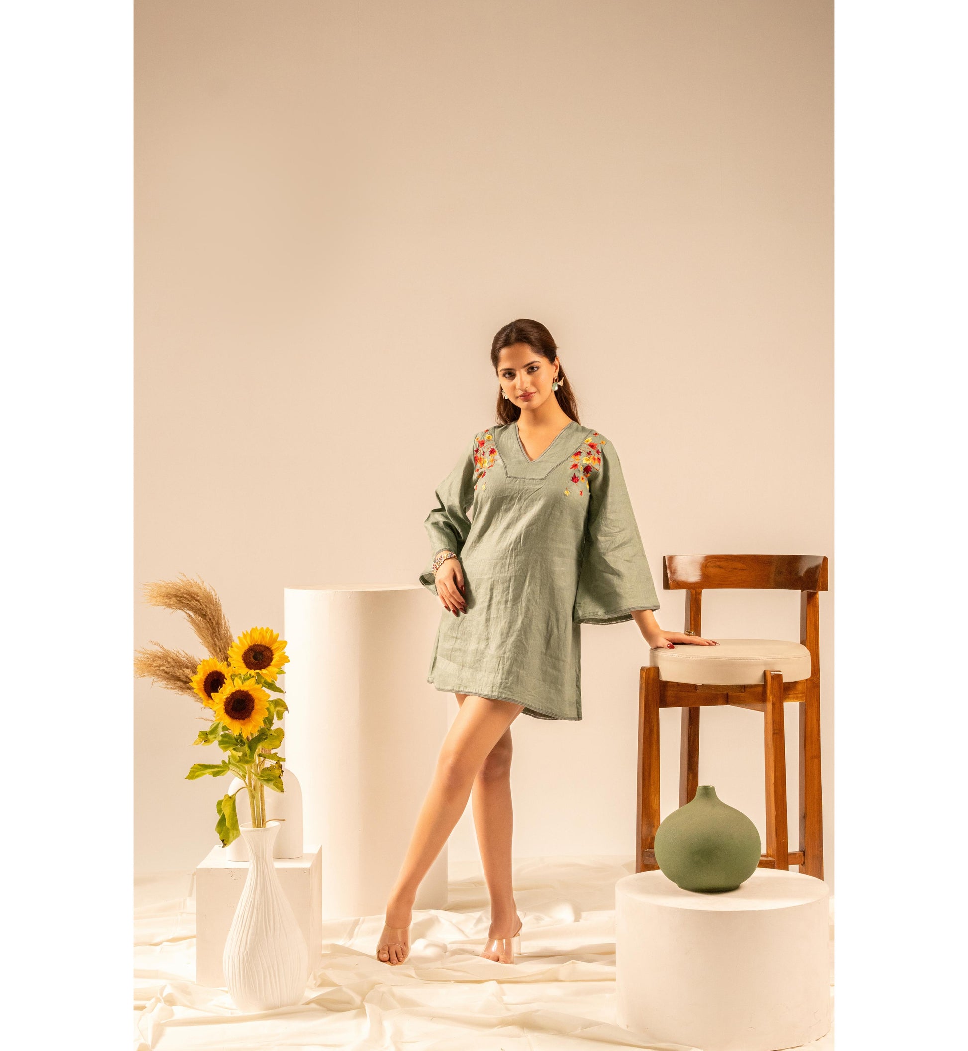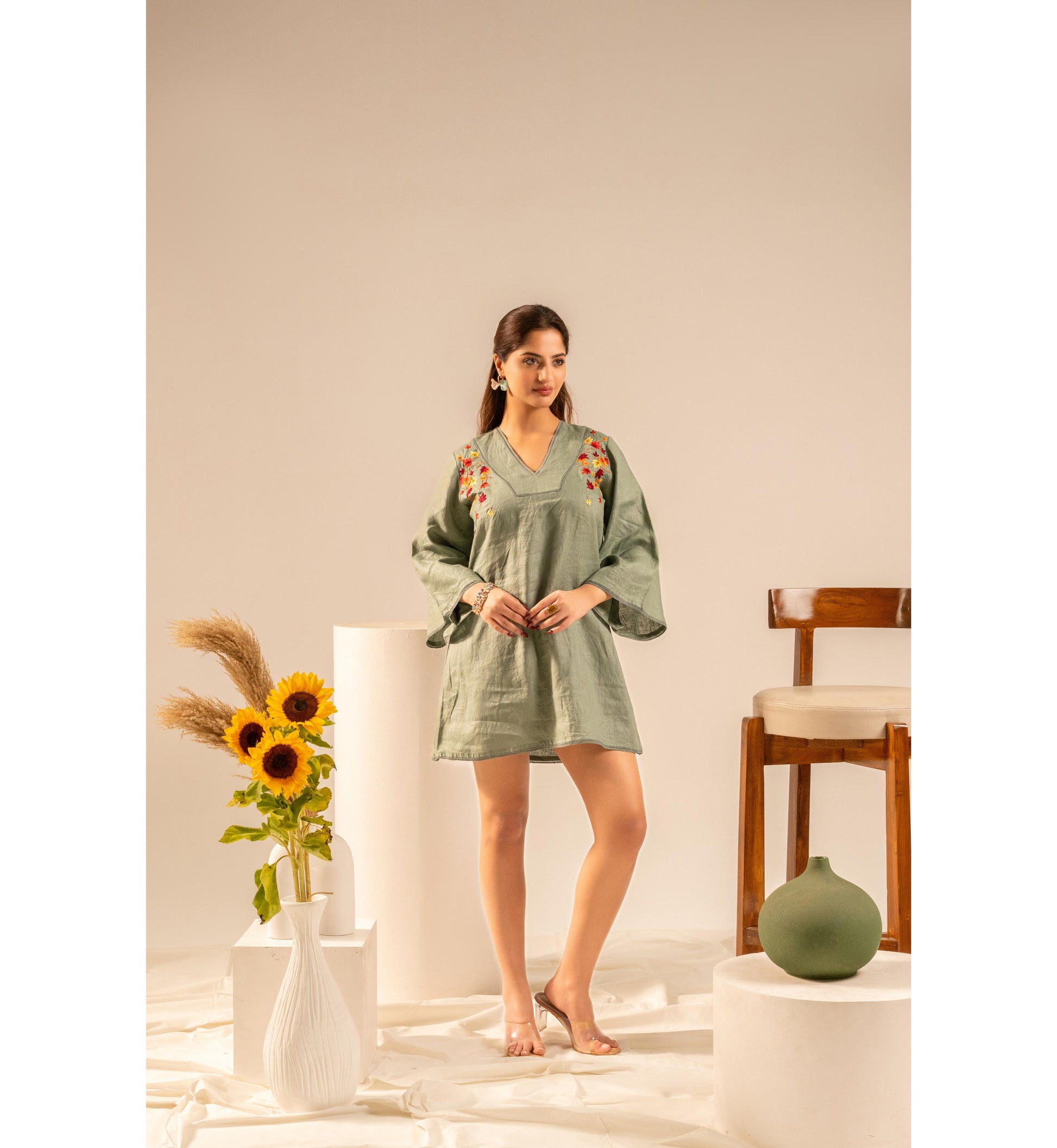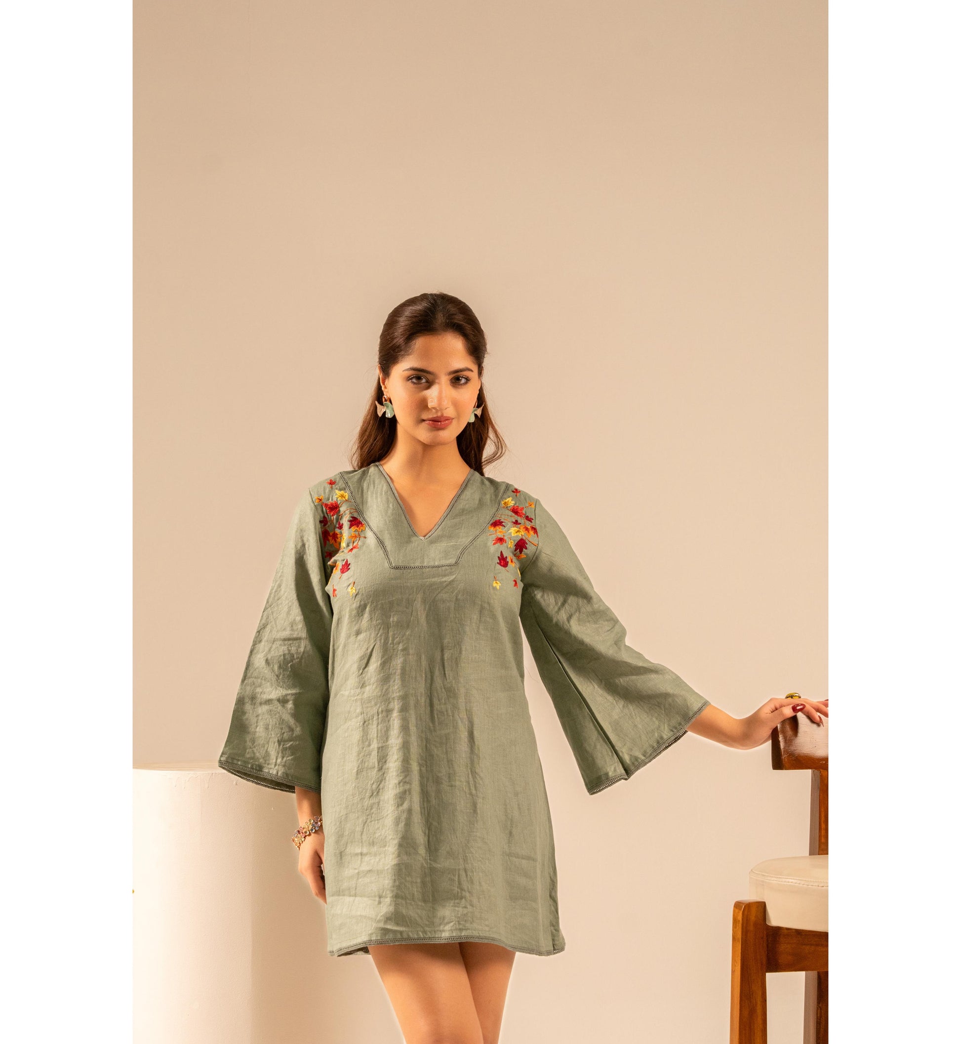 Chic, effortless, and beautifully detailed, the Maple Muse Mini Dress blends earthy elegance with playful charm. Crafted in a soothing olive green tone, this dress features delicate floral embroidery on the shoulders that adds a subtle yet striking touch. The relaxed silhouette and breezy sleeves create a comfortable, easygoing look—perfect for brunch dates, vacations, or casual outings. Designed for women who love understated style with thoughtful details.