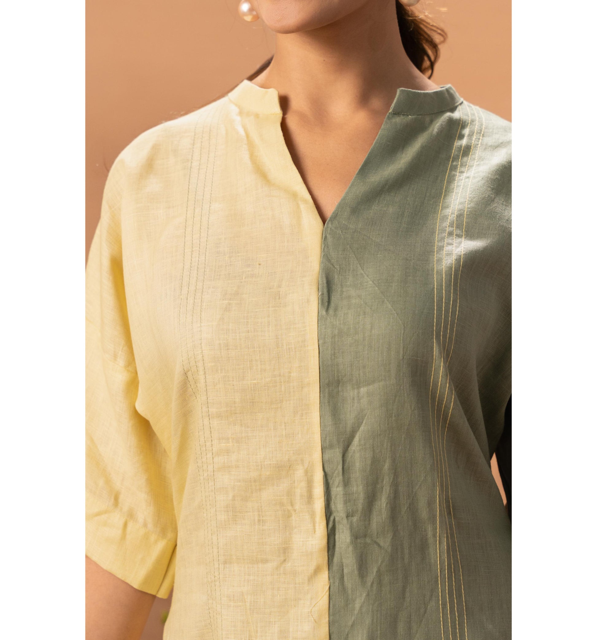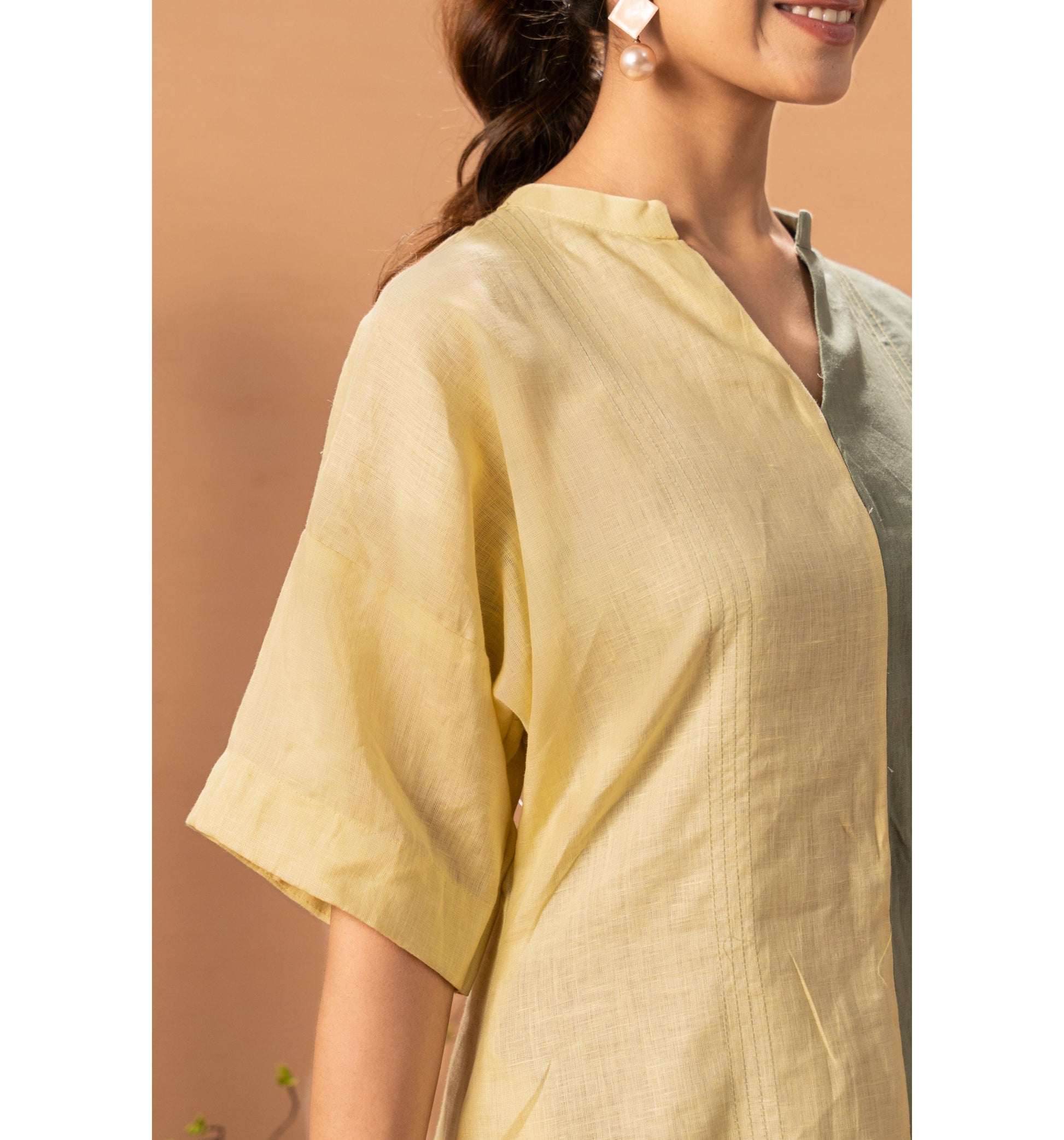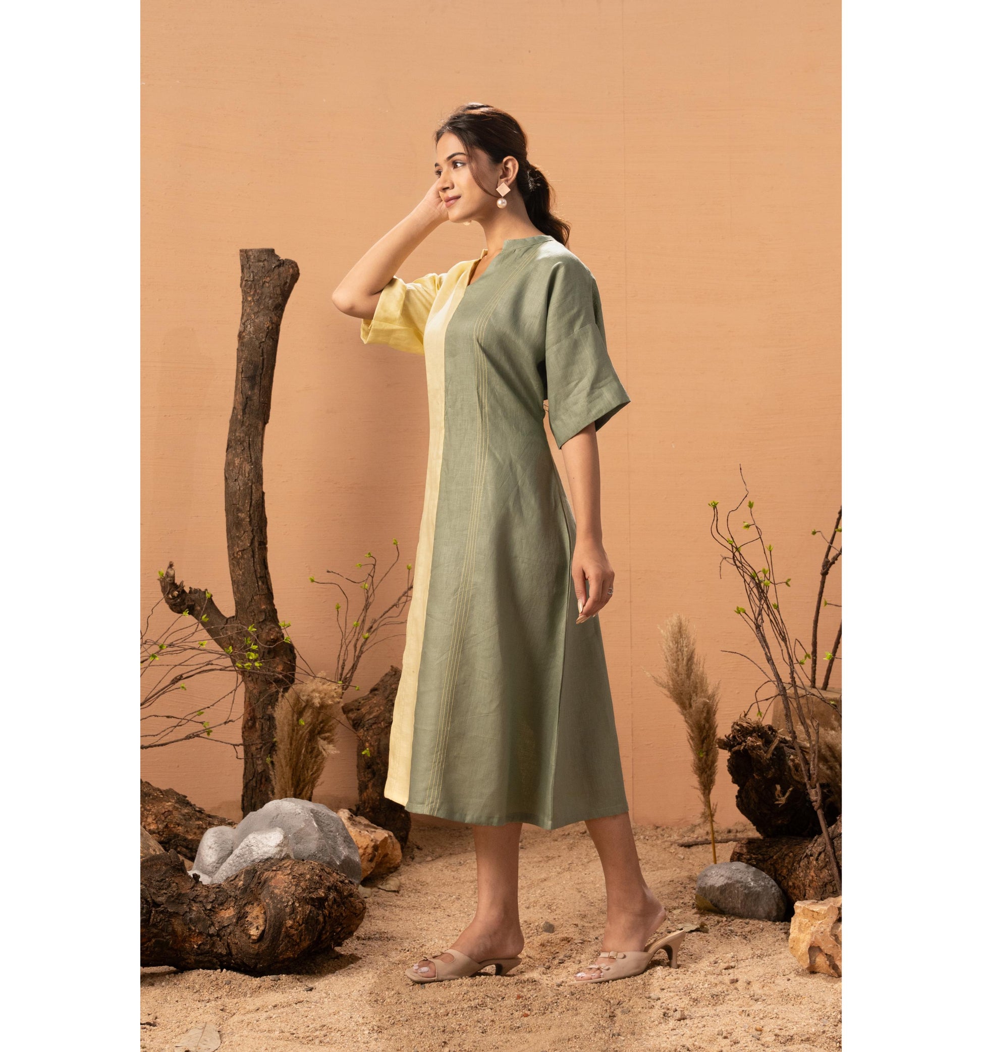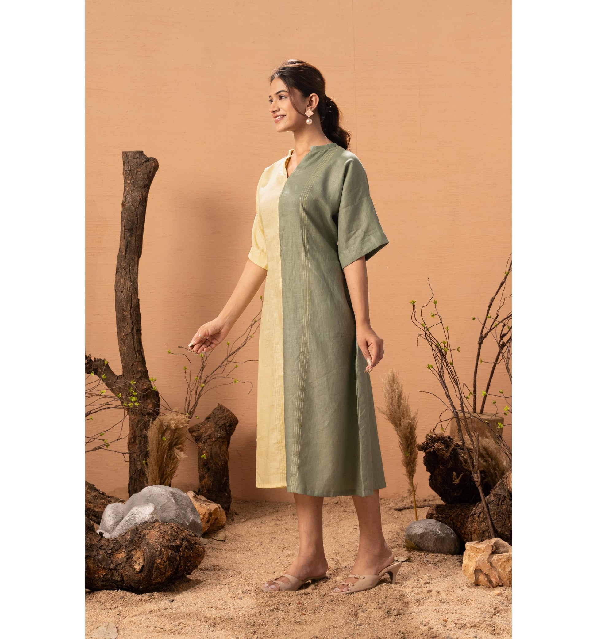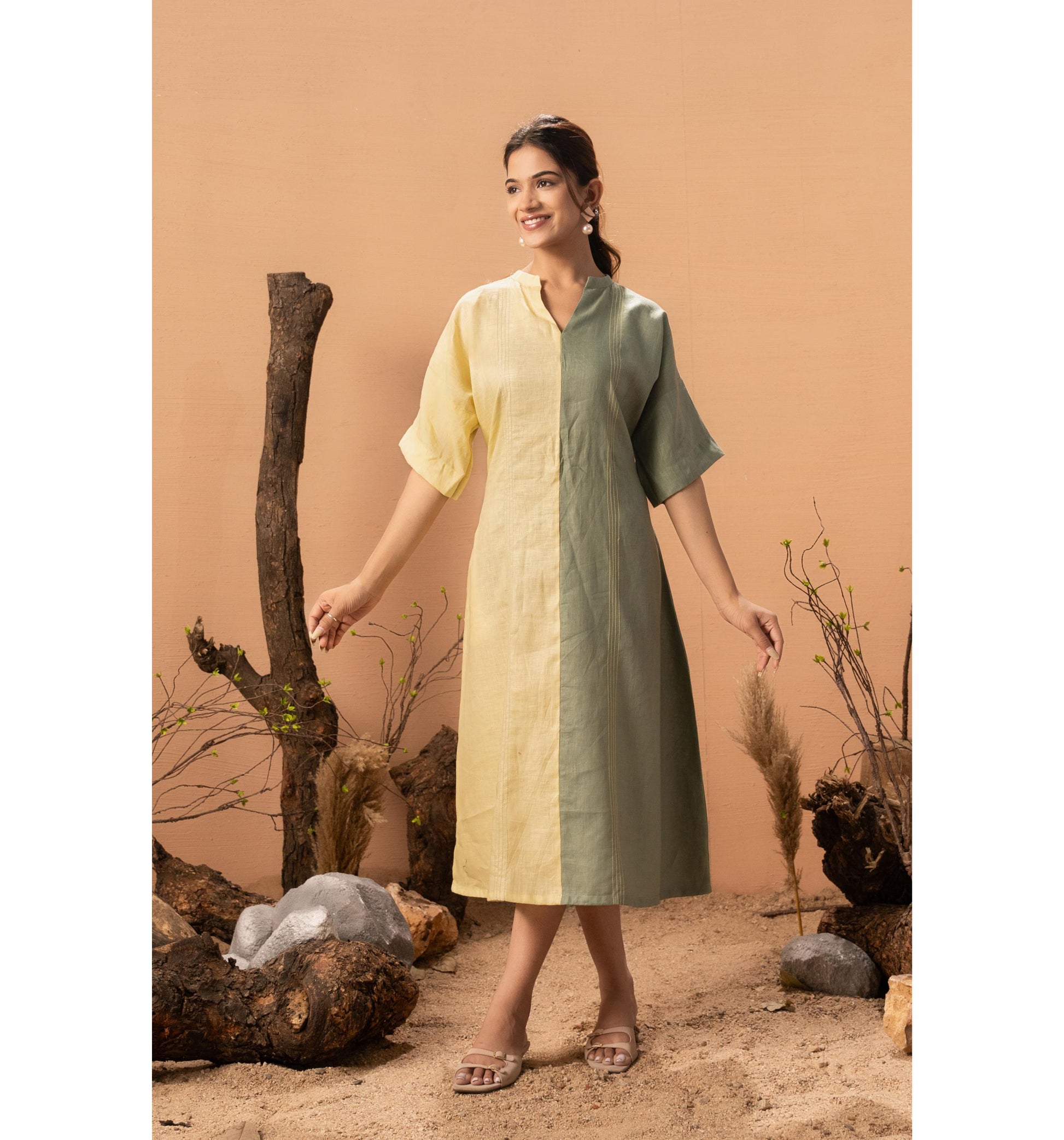 Effortlessly elegant and refreshingly modern, the Two Tone Tranquil Dress is designed for women who love minimal style with a striking twist. Featuring a beautiful half-and-half colour block in soft Lemon Yellow and subtle Olive Green, this dress brings balance, calm, and contemporary charm to your wardrobe. The relaxed silhouette and breathable fabric make it perfect for all-day comfort—whether you’re heading to brunch, a work meeting, or a casual evening out. Simple, sophisticated, and quietly bold.