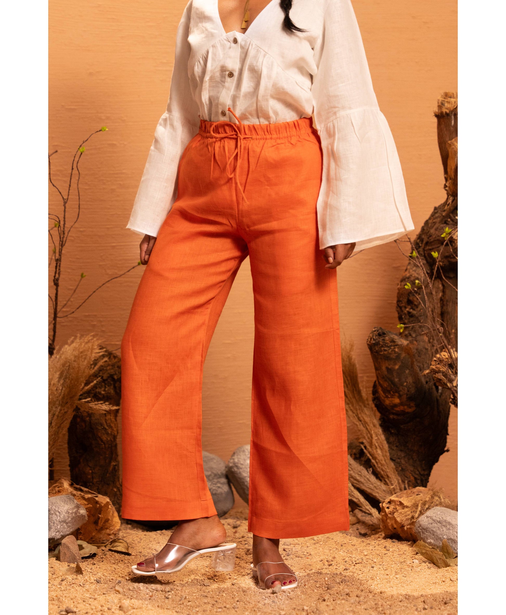 A bold yet effortlessly chic statement, the Orange Velin Palazzo Pants bring a vibrant pop to your everyday wardrobe. Made from 100% pure linen, they offer a breezy, relaxed silhouette that moves with ease. Finished with a soft elasticated waistband and drawstring tie, these pants blend comfort with elevated style — perfect for brunch days, travel looks, and mellow summer evenings.